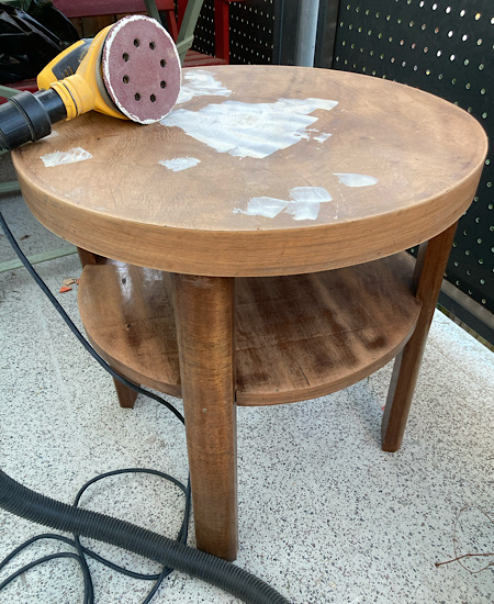 Um dem Tisch neues Leben einzuhauchen, wurden zunächst die beschädigten Stellen gespachtelt. Anschließend habe ich das gesamte Tischchen vollständig geschliffen, bis eine glatte und gleichmäßige Oberfläche entstand. Dieser Schritt ist besonders wichtig, da er die Grundlage für alle weiteren Arbeiten bildet.