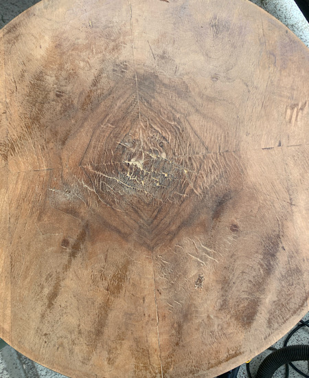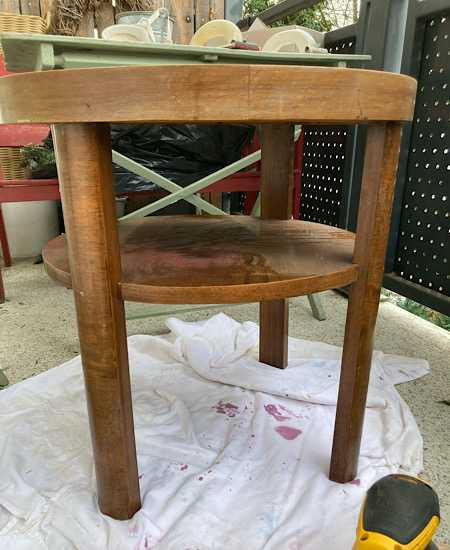 Dieser kleine Beistelltisch mit unterer Ablage stammt aus einer Haushaltsauflösung. Auf den ersten Blick war er unscheinbar, doch seine stabile Konstruktion und die schöne Grundform ließen sofort erkennen, dass da Potenzial in ihm steckte. Zwar war das Tischchen insgesamt intakt, allerdings hatte die Oberfläche über die Jahre deutlich gelitten. Besonders die Tischfläche war an vielen Stellen ramponiert und zeigte Gebrauchsspuren, die nicht mehr zu übersehen waren.