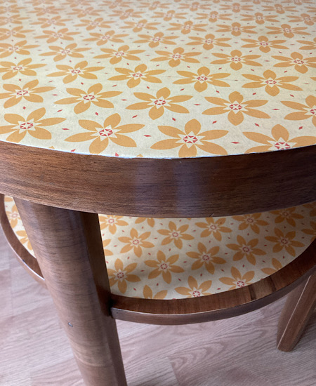 Das Papier wurde anschließend passgenau zugeschnitten und sowohl auf der Tischfläche als auch auf der unteren Ablage aufgebracht. Zum Abschluss wurde das Tischchen mehrfach mit mattem Lack versiegelt. Diese Schutzschicht sorgt dafür, dass die Oberfläche nicht nur optisch ruhig und edel wirkt, sondern auch wasser- und stoßfest ist – genau richtig für eine entspannte und alltagstaugliche Nutzung.