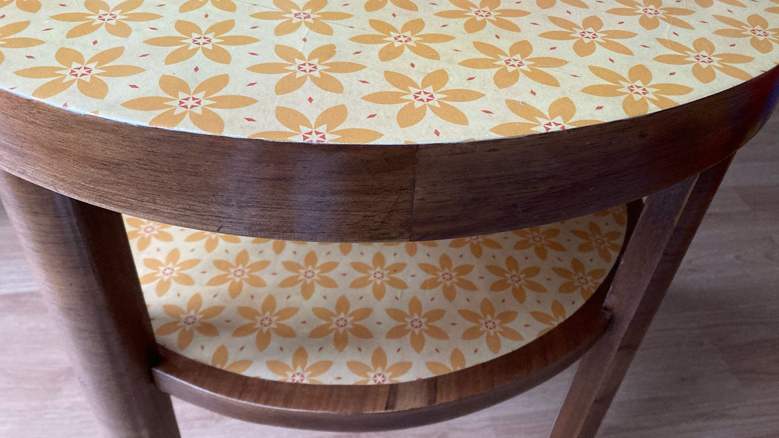 Das Papier wurde anschließend passgenau zugeschnitten und sowohl auf der Tischfläche als auch auf der unteren Ablage aufgebracht. Zum Abschluss wurde das Tischchen mehrfach mit mattem Lack versiegelt. Diese Schutzschicht sorgt dafür, dass die Oberfläche nicht nur optisch ruhig und edel wirkt, sondern auch wasser- und stoßfest ist – genau richtig für eine entspannte und alltagstaugliche Nutzung.