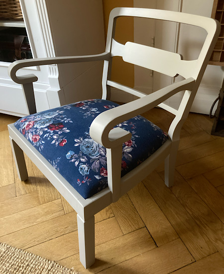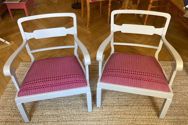 Viel Zeit habe ich mit Teil „Drei“ verbracht: einen passenden Bezugsstoff zu finden, der mir wirklich gefällt. Doch ich fand keinen. So bekamen die Sesselchen irgendeinen Stoff, der die unschöne grüne Sitzfläche provisorisch verdeckte.