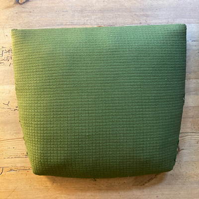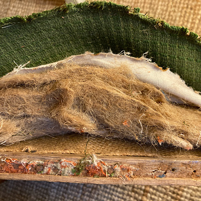 Im zweiten Schritt wurde der alte grüne Bezugsstoff abgenommen. Man kann gut die mehrlagige Polsterschicht sehen, die an der Seite des Rahmens mit unzähligen (!) Nägeln befestigt war. Und ich machte mir die wirklich unschöne Arbeit, alle Nägel zu entfernen. Ich hätte das nicht tun müssen und die Nägel stecken lassen können, weil ich das neue Polster dort nicht befestigen wollte. Doch ich wollte sie entfernen – für ein schöneres Gefühl!