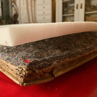 Die niedrigen Sessel saßen sich wirklich schön, wie ich fand. Doch war die Polsterung über dem Federkorb veraltet, so dass man die Federn spürte. Also kaufte ich Polstermaterial, um das Polster zu erneuern. Ich startete Teil „Zwei“.