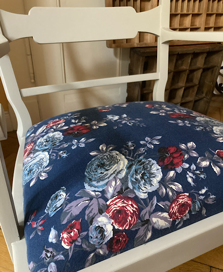 Für den Bezug zumindest eines Sessels habe ich den Stoff einer alten Bluse genommen. Farbe und Blumenmuster gefallen mir sehr und passen zur Farbe des Gestells. Und für den anderen? Mal sehen, vielleicht nähe ich die Stoffreste zu einem Stück zusammen…