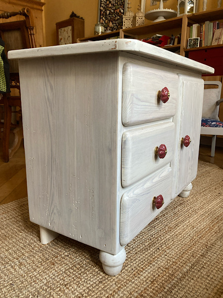 Kleine Kommode/ Schränkchen mit 3 Schüben, weißgrau lasiert. Was aus einem Straßenfund entstehen kann, liest du hier! Beachte, dass es dennoch ein altes Möbelstück ist.