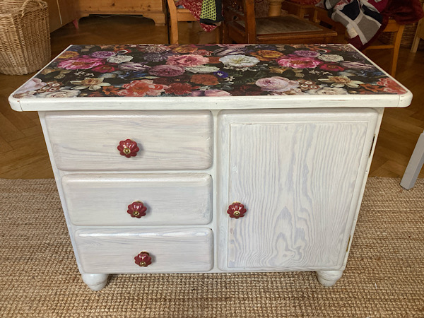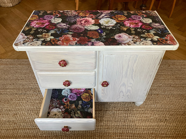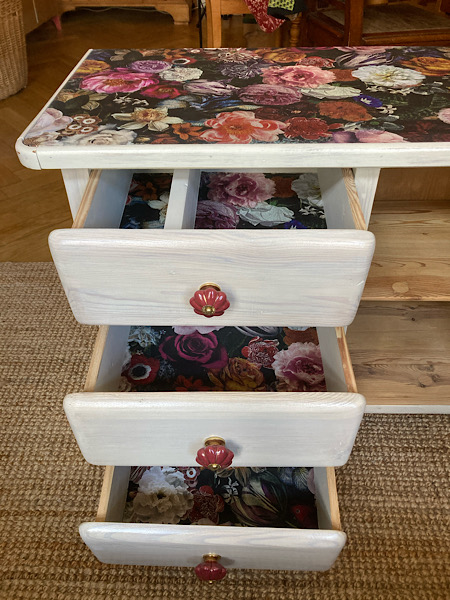 Kommode mit drei Schubladen. Geschliffen, gestrichen und mit Farbe & fröhlichem Papier gestaltet. Den Beitrag zur Neugestaltung findest du hier.