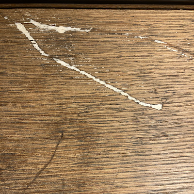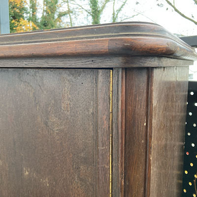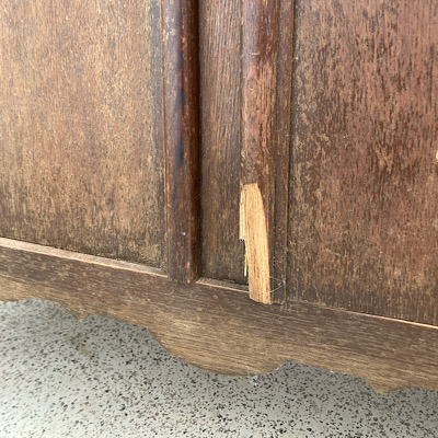 Wie immer erfolgte zunächst eine Grundreinigung. Anschließend wurde repariert und ausgebessert. Mit Reparaturknete modellierte und passte ich die Zierleiste an, alle Kratzer und Risse wurden aufgefüllt und in der Rückwand zwei Löcher verschlossen. Dann hieß es gründlich schleifen, um allen Schmutz und alte Lackreste zu entfernen.