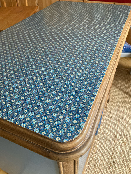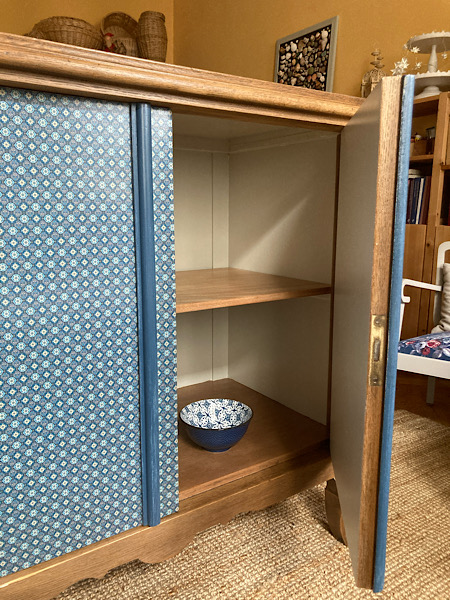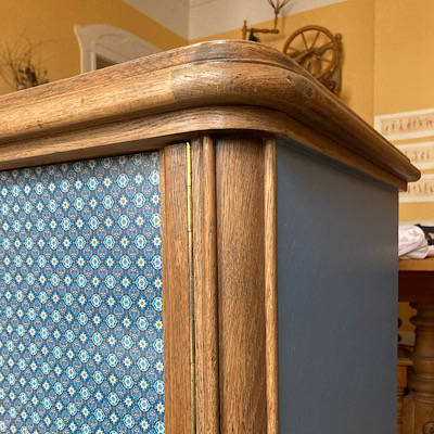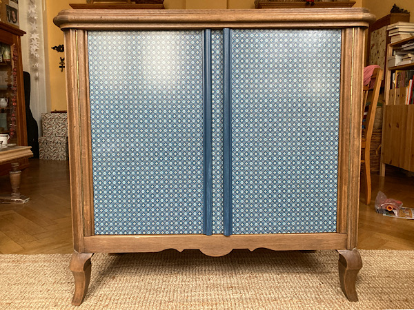 Die Papierbögen wurden zugeschnitten und auf die Platte und die Türen aufgebracht. Dann wurden sie geglättet, getrocknet und schließlich mehrfach lackiert. So ist vor allem auch die Oberfläche gut geschützt. Die Seiten wurden in einem Hellblau gestrichen, das sich im Muster des Papiers wiederfindet.