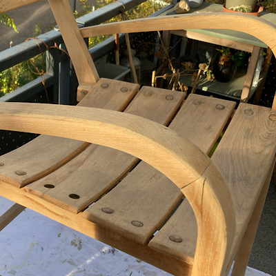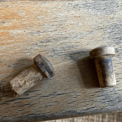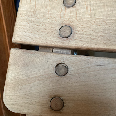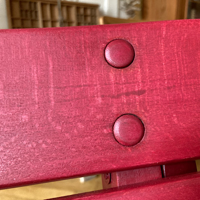 Doch dann realisierte ich, dass diese runden Holzteilchen keine Abdeckkappen waren, sondern Holzdübel mit einem Kopf. Sie saßen fest, weil sie wahrscheinlich eingeleimt waren. Ich fürchtete, beim Herausschlagen irgendetwas zu zerstören und machte mich an die Arbeit, den Stuhl per Hand zu schleifen.