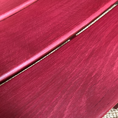 Der Wunsch der Kundin war, ihn in einem bestimmten Rot zu streichen, aber so, dass die Maserung sichtbar bleibt. Das gelang auch überwiegend, doch an manchen Stellen blieb die Optik fleckig und unschön, daher bekamen diese einen dritten, etwas deckenderen Farbauftrag.