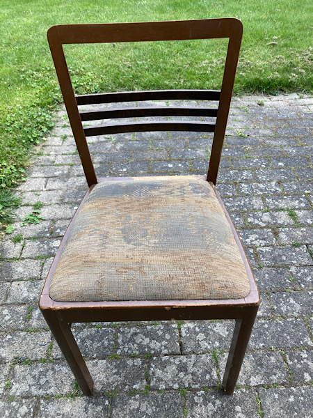 Aus einer Wohnungsauflösung erhielt ich diese Zwei: aus Buchenholz, schlicht im Aussehen aber völlig intakt, ohne Wurmbefall und stabil. Durch das große Polster saß man sehr bequem, was für mich der Grund war, sie zu bearbeiten.