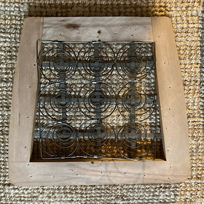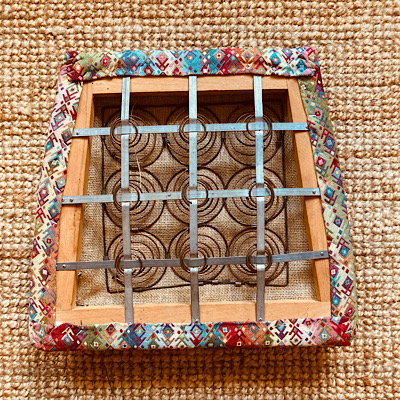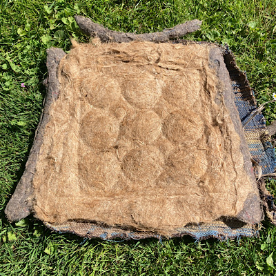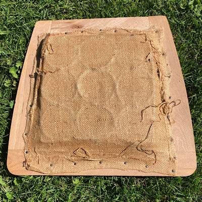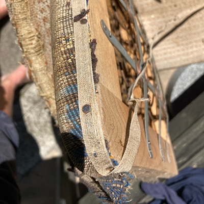 Anschließend musste ich mich um das Polster kümmern. Hier kannst du sehen, wie das alte Polster aussah, nachdem ich es abgenommen hatte: bestehend aus mehreren Lagen von Polsterwatte und alter Jute. Eine Menge Nägel waren zu entfernen, bevor ich daran weiterarbeiten konnte. Am Ende ist da nur noch der Federkorb, der am Rahmen befestigt ist. Damit arbeitet man dann weiter.