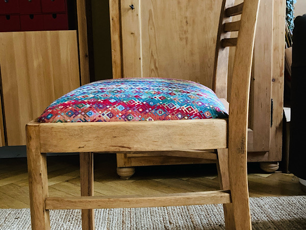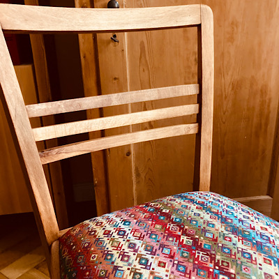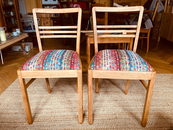 Und dann warteten die Polster, mit dem weißen Abschlussflies bespannt, auf einen passenden Bezugsstoff. Den hatte ich ewig nicht finden können. Doch Anfang November fand in Leipzig ein Stoffe-Markt statt und dort wurde ich am Sonntag fündig mit einem farbenfrohen, robusten Gobelin-Stoff. Nach dieser abschließenden Arbeit waren die Stühle fertig!