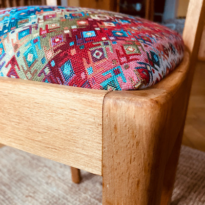 Zuerst trug ich den alten Lack mit Heißluftföhn und Spachtel ab, anschließend wurde das Holz gründlich geschliffen. Damit der Stuhl seine schöne Holzoptik bewahren und trotzdem beansprucht und genutzt werden kann, habe ich ihn mit meinem versiegelnden Lieblingsholzöl gestrichen. Mehr zum Thema „Ölen oder Wachsen?“ kannst du in diesem Beitrag lesen.