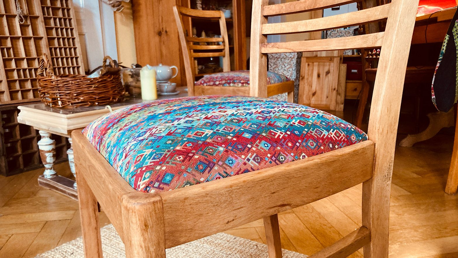 Manchmal braucht es gar nicht viel, um alten Möbeln neues Leben einzuhauchen. Zwei braune Stühle hatten schon bessere Tage gesehen – also verpasste ich ihnen mit Schleifpapier und einem knallbunten Stoff ein frisches Make-over. Jetzt bringen sie endlich wieder Farbe, Wärme und gute Laune in die Küche!
